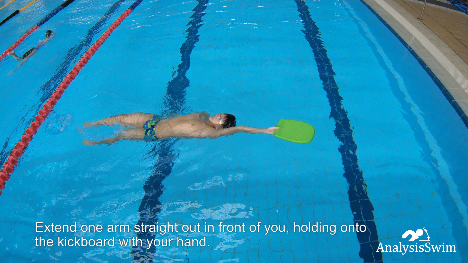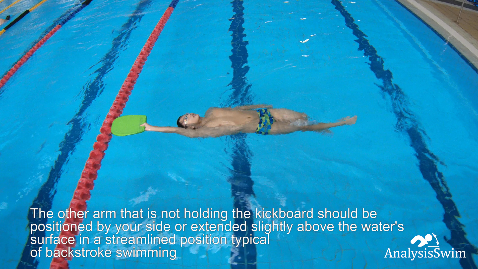 The other arm that is not holding the kickboard should be positioned by your side or extended slightly above the water’s surface, in a streamlined position typical of backstroke swimming.