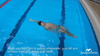 While your right arm is pulling underwater, your left arm remains extended above your head. Keep it streamlined with your body to minimize drag.