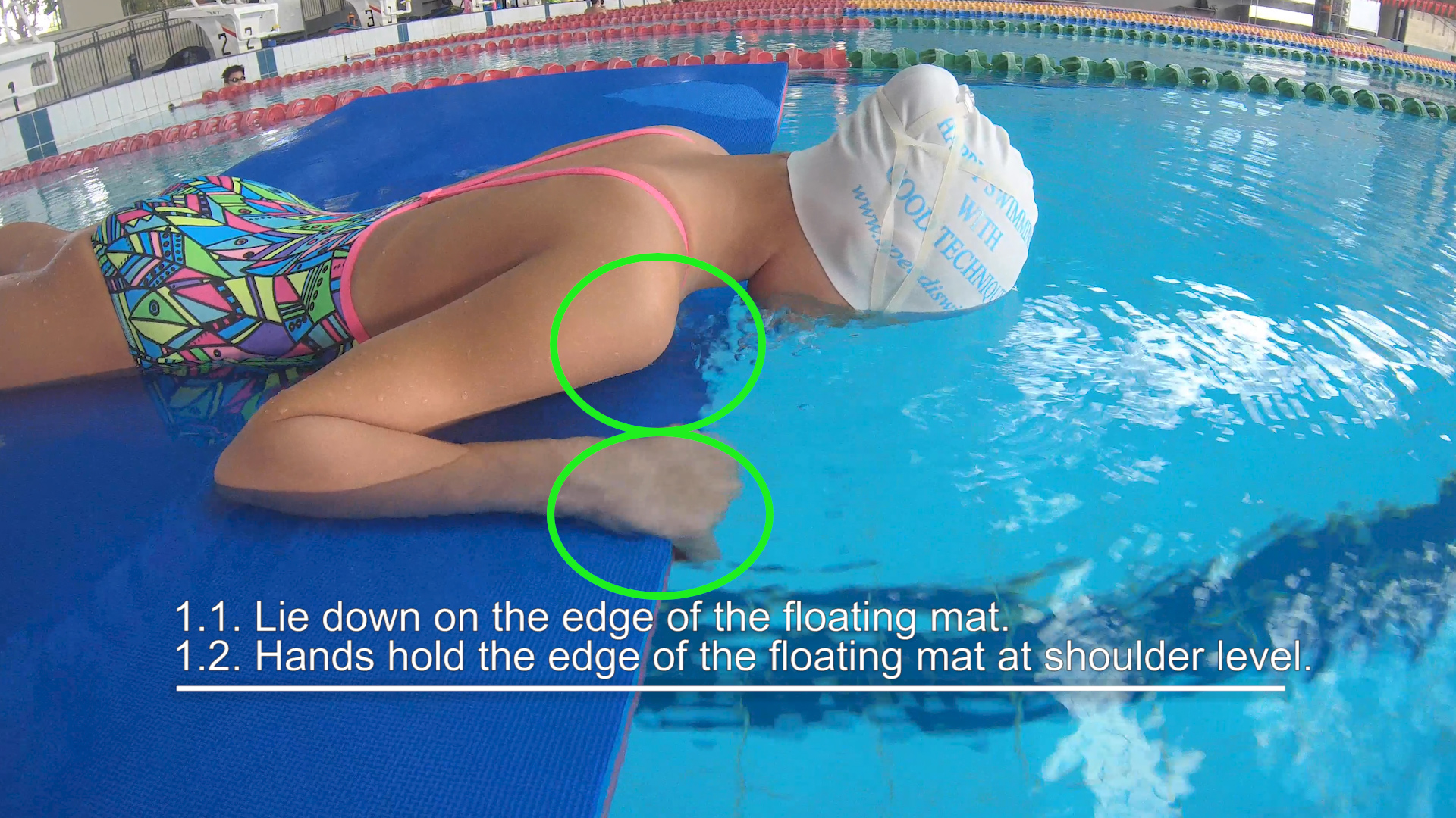 1. Lie down on the edge of the floating mat. Hands hold the edge of the floating mat at shoulder level.