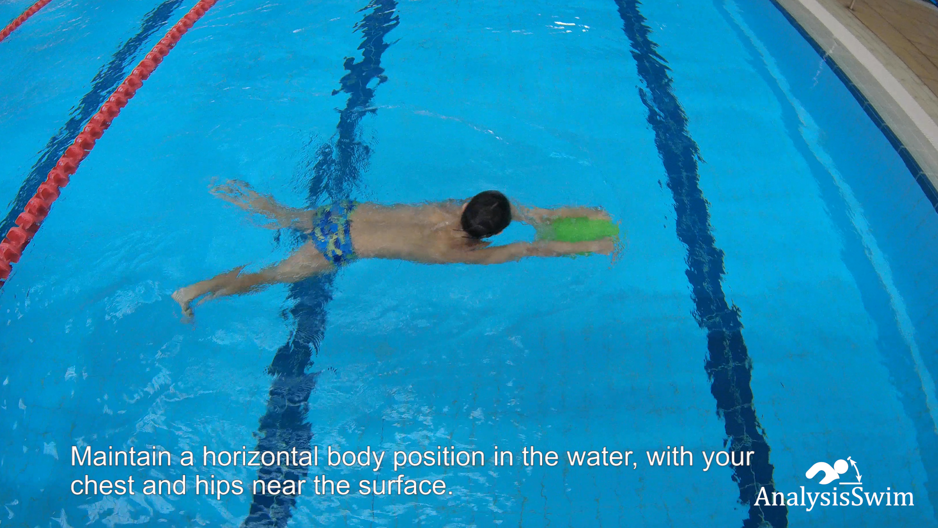 Maintain a horizontal body position in the water, with your chest and hips near the surface. Avoid allowing your hips to sink or your legs to drop too low, as this can increase drag and make it more challenging to maintain forward momentum.