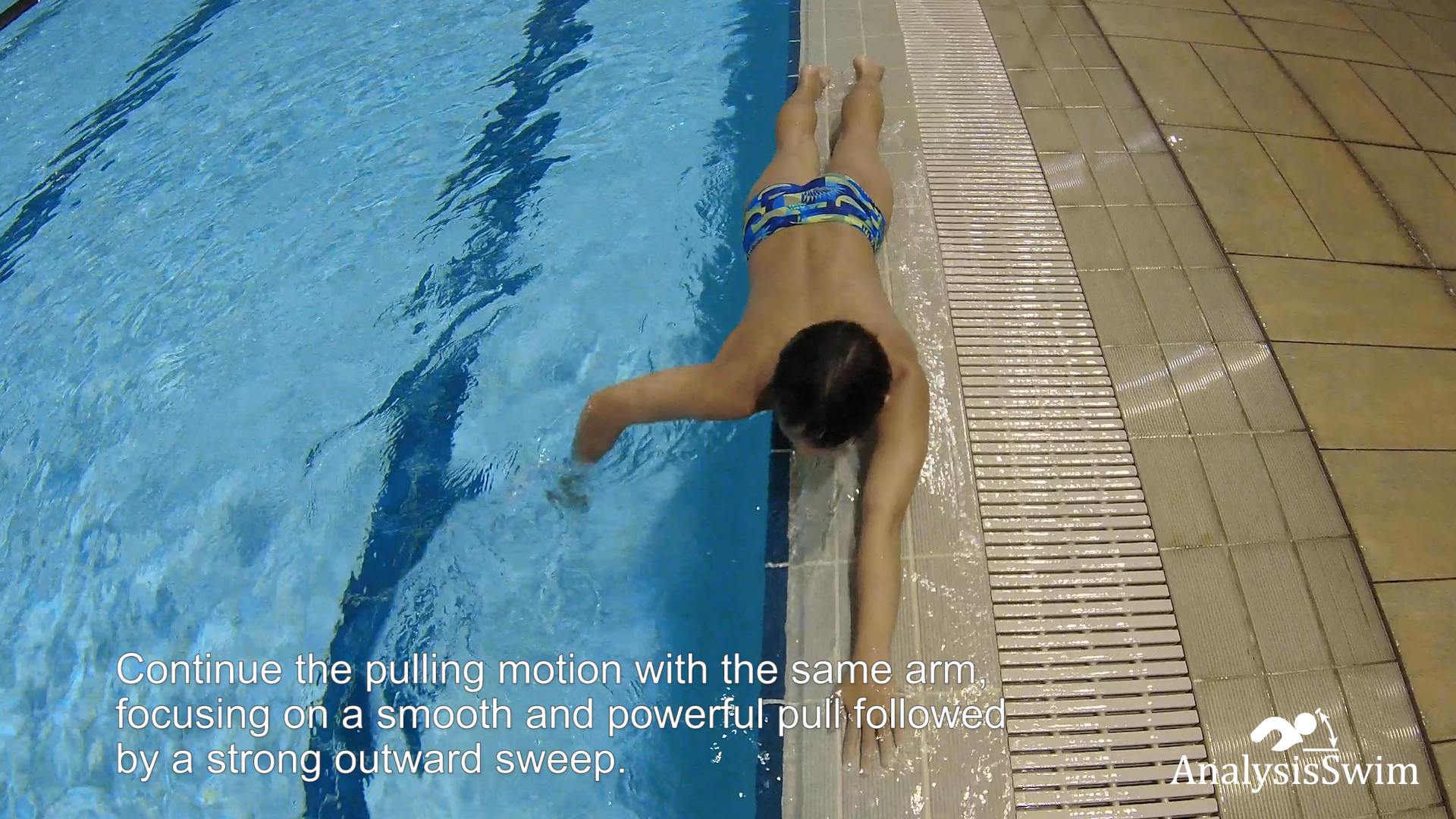 Continue the pulling motion with the same arm, focusing on a smooth and powerful pull followed by a strong outward sweep.