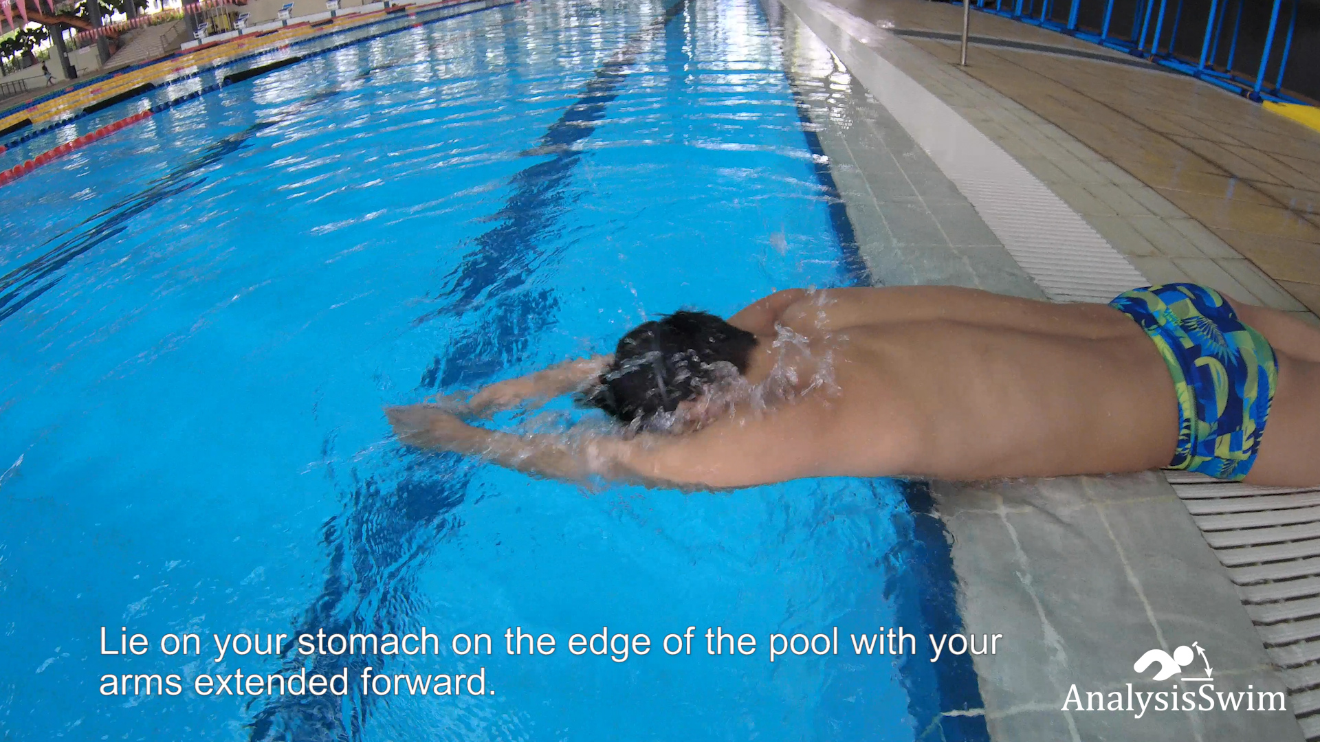 Lie on your stomach on the edge of the pool with your arms extended forward. Your body should be straight and parallel to the water’s surface.