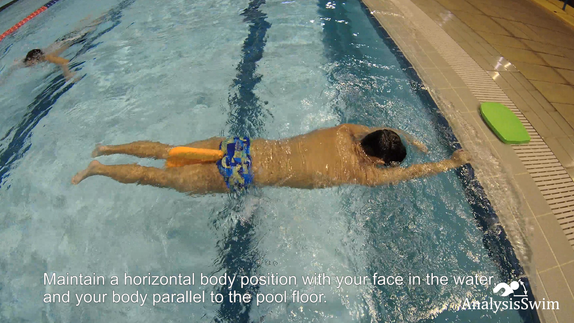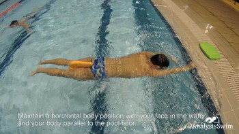 Maintain a horizontal body position with your face in the water, and your body parallel to the pool floor. Keep your legs straight and close together.
