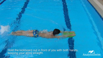 Hold the kickboard out in front of you with both hands, keeping your arms straight. Your body should be in a streamlined position with your face in the water.
