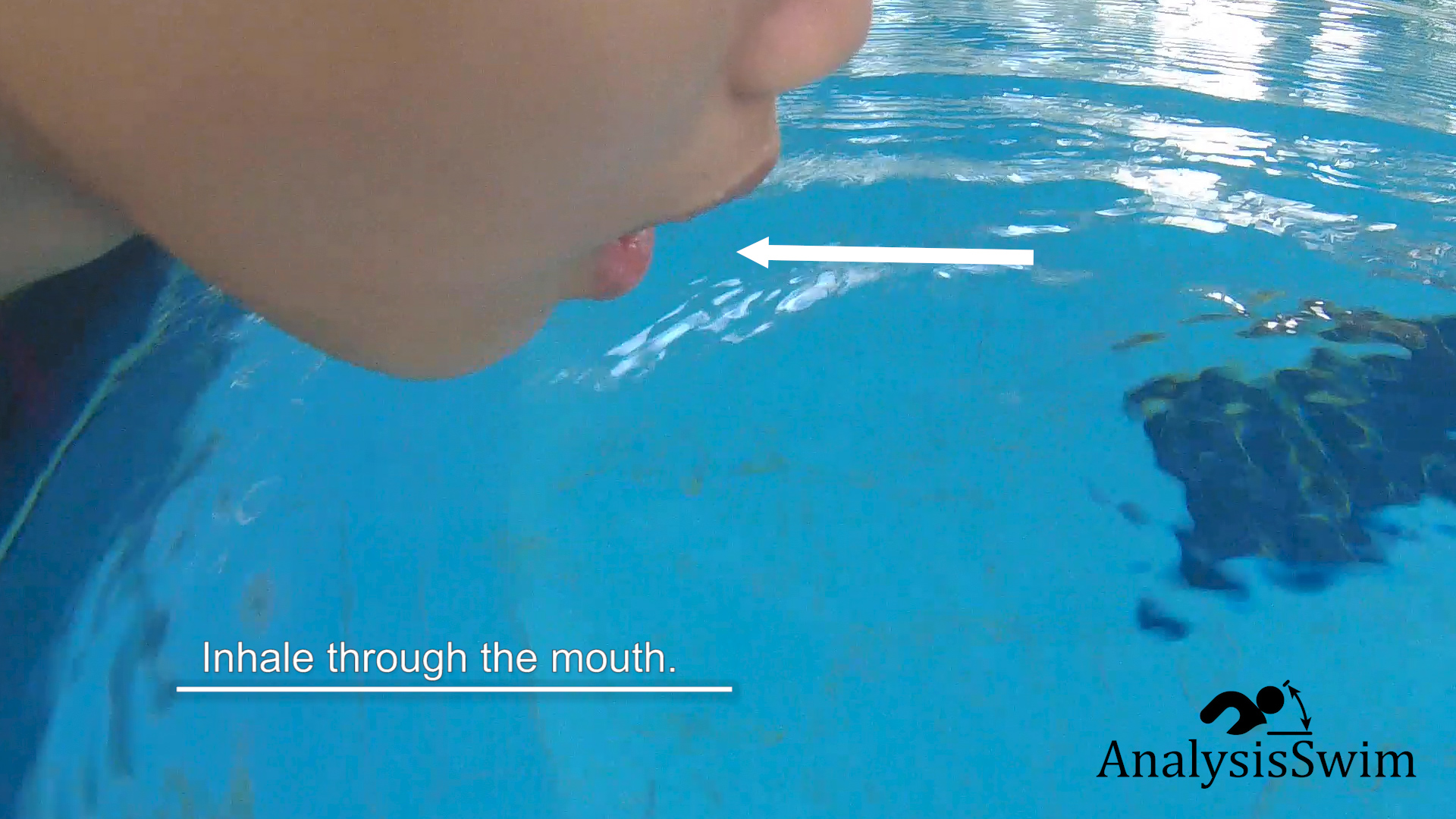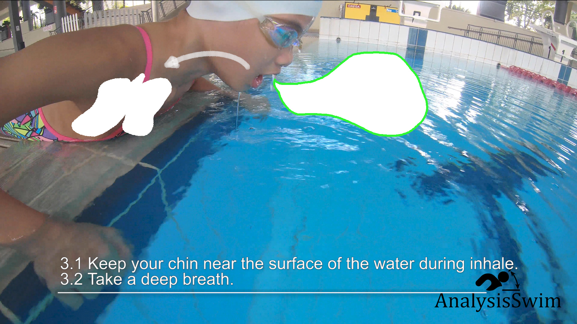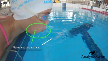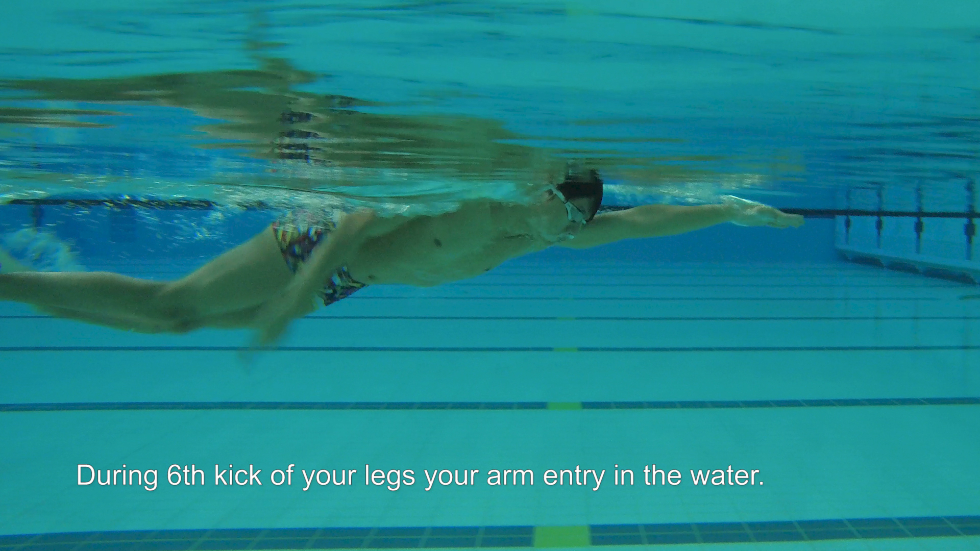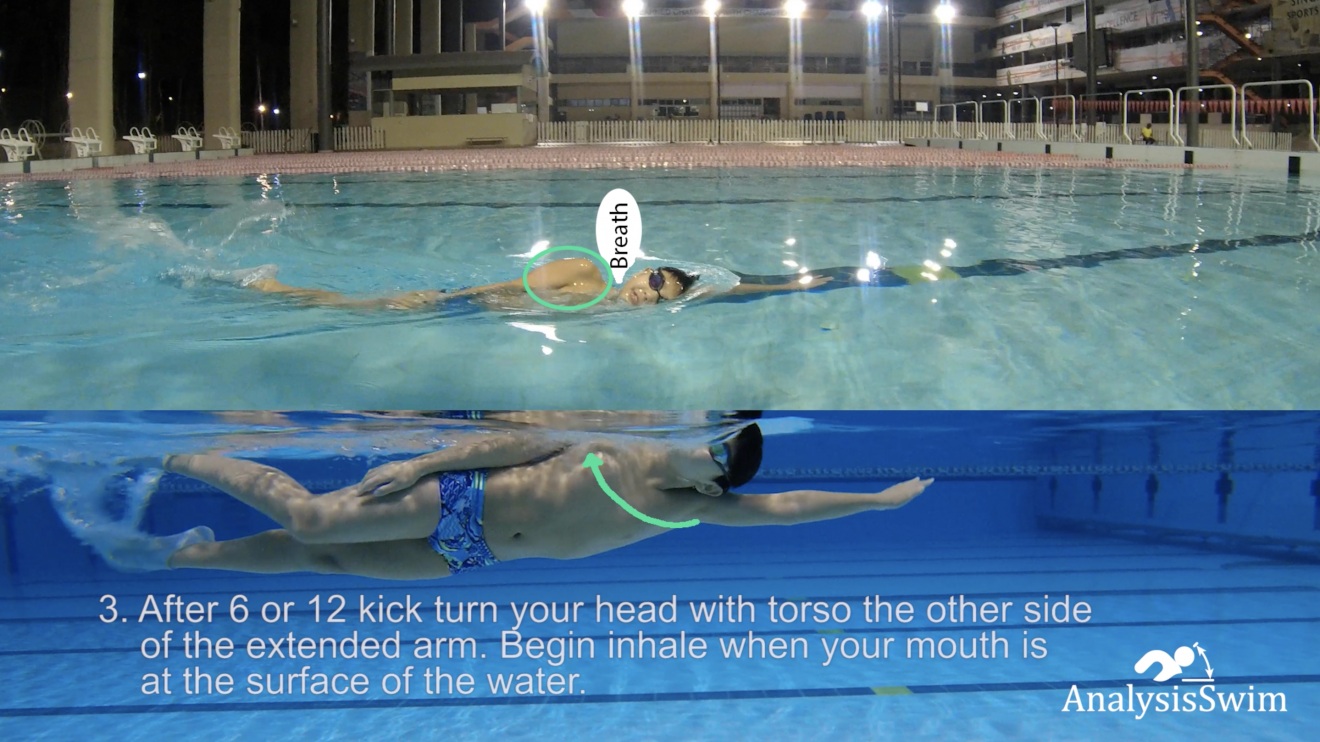 3. After 6 or 12 kick turn your head with torso to the other side of the extended arm. Begin inhale when your mouth is at the surface of the water.