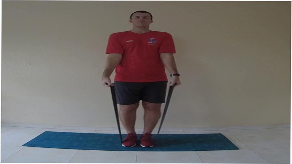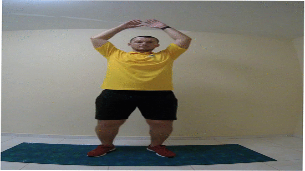 4. We begin to make rotational movements with our hands in front, press the chin to the chest and tilt the body in front.