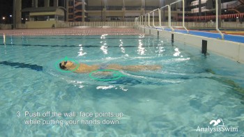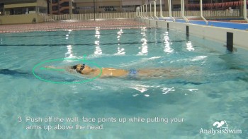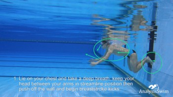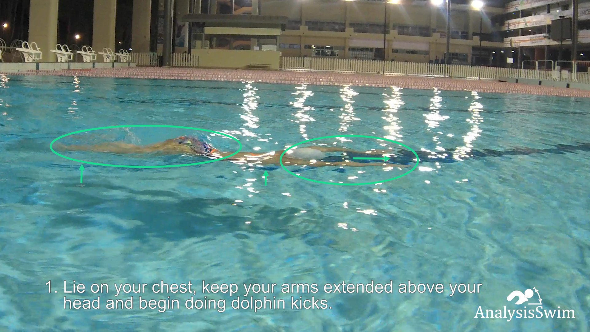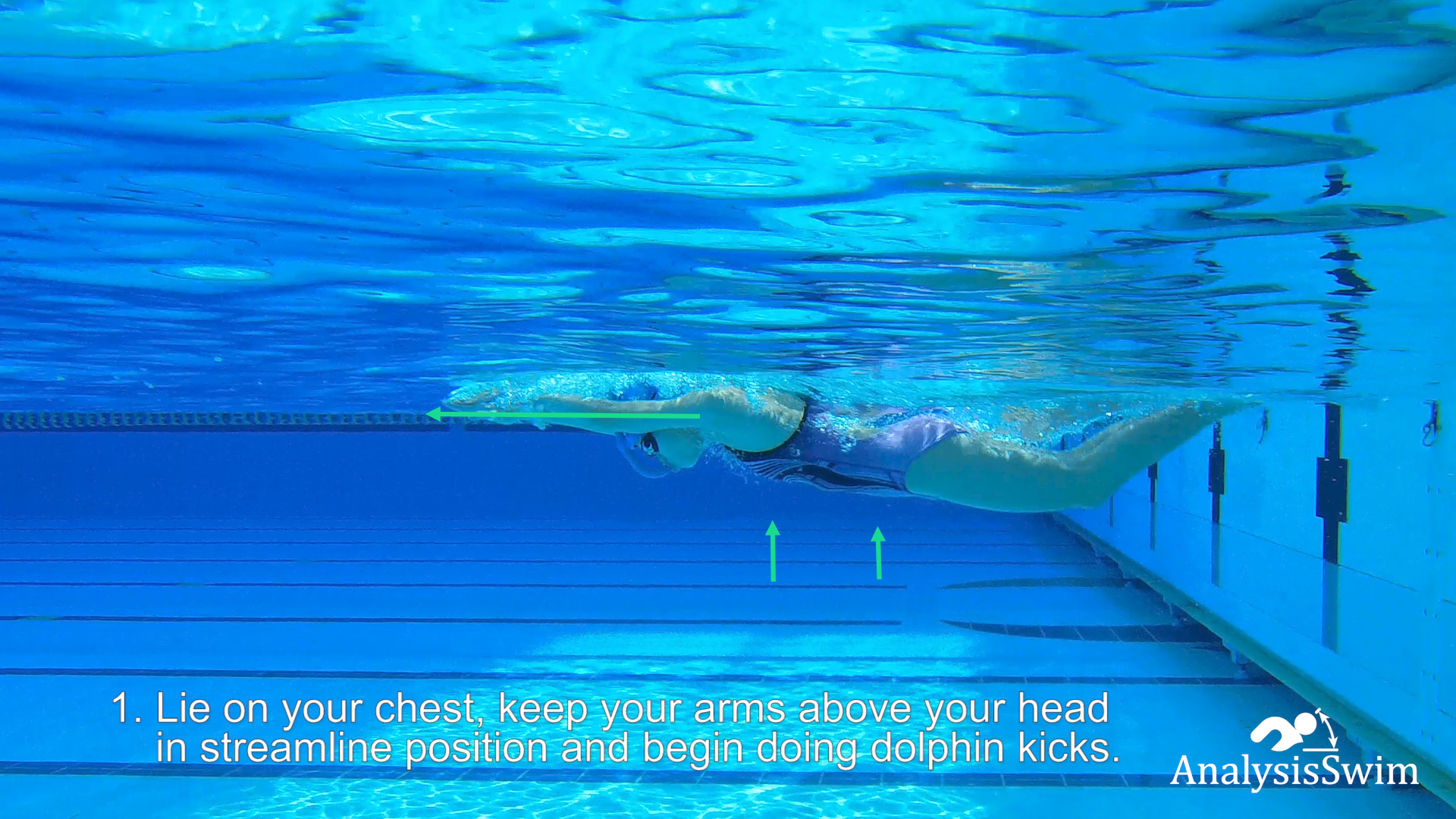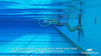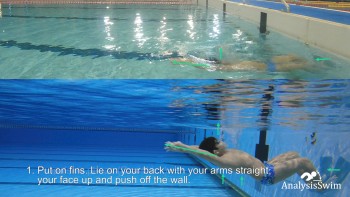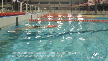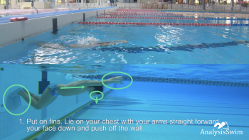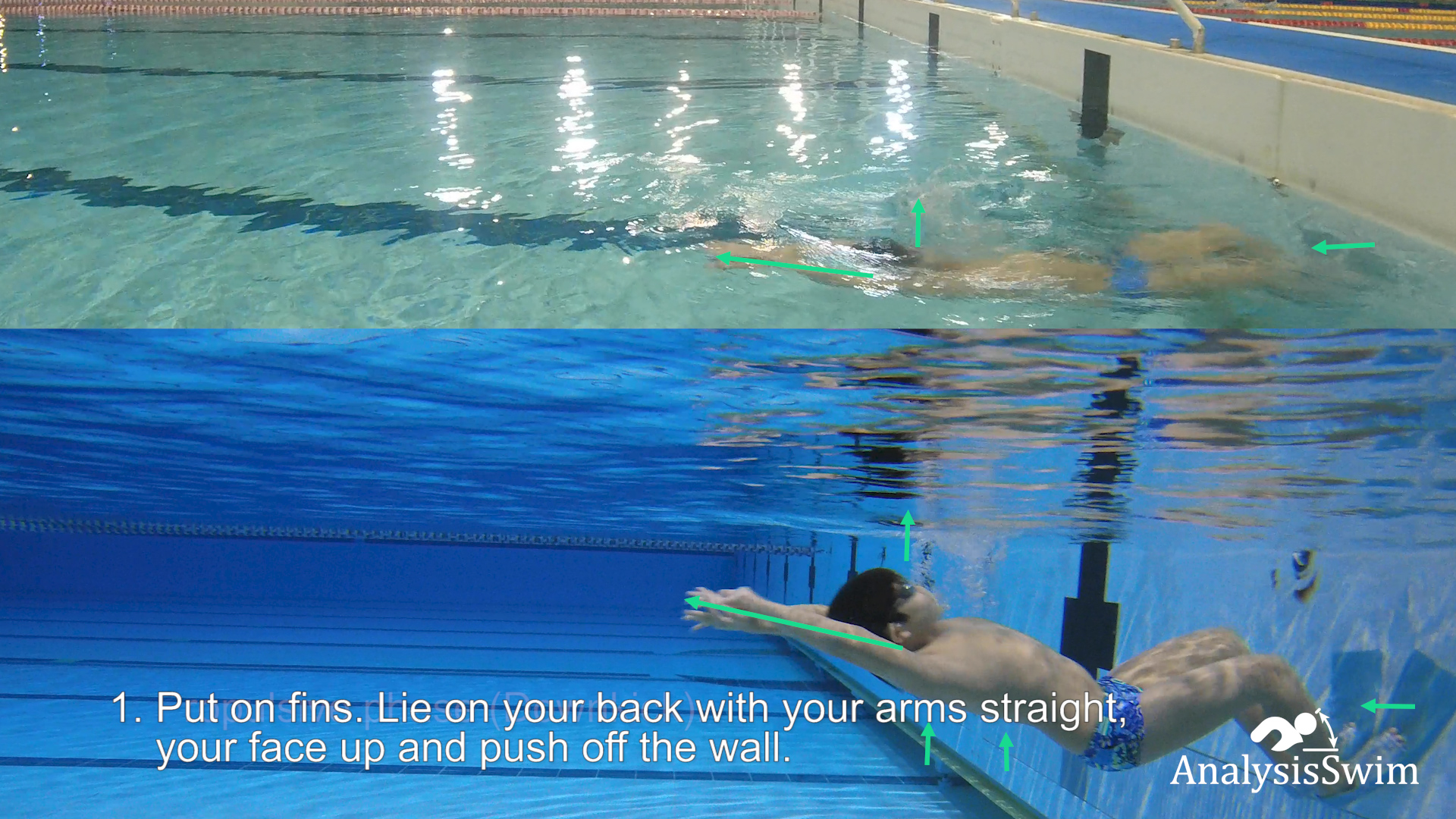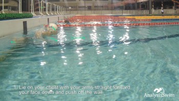 1. Put on fins. Lie on your chest with your arms straight forward, your face down and push off the wall.