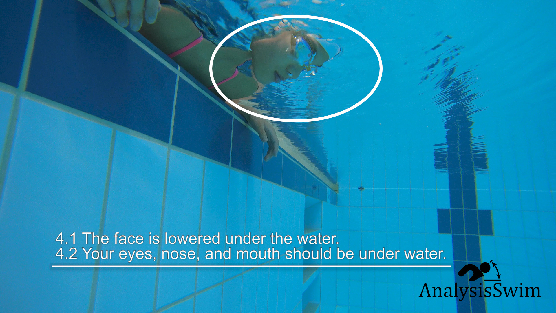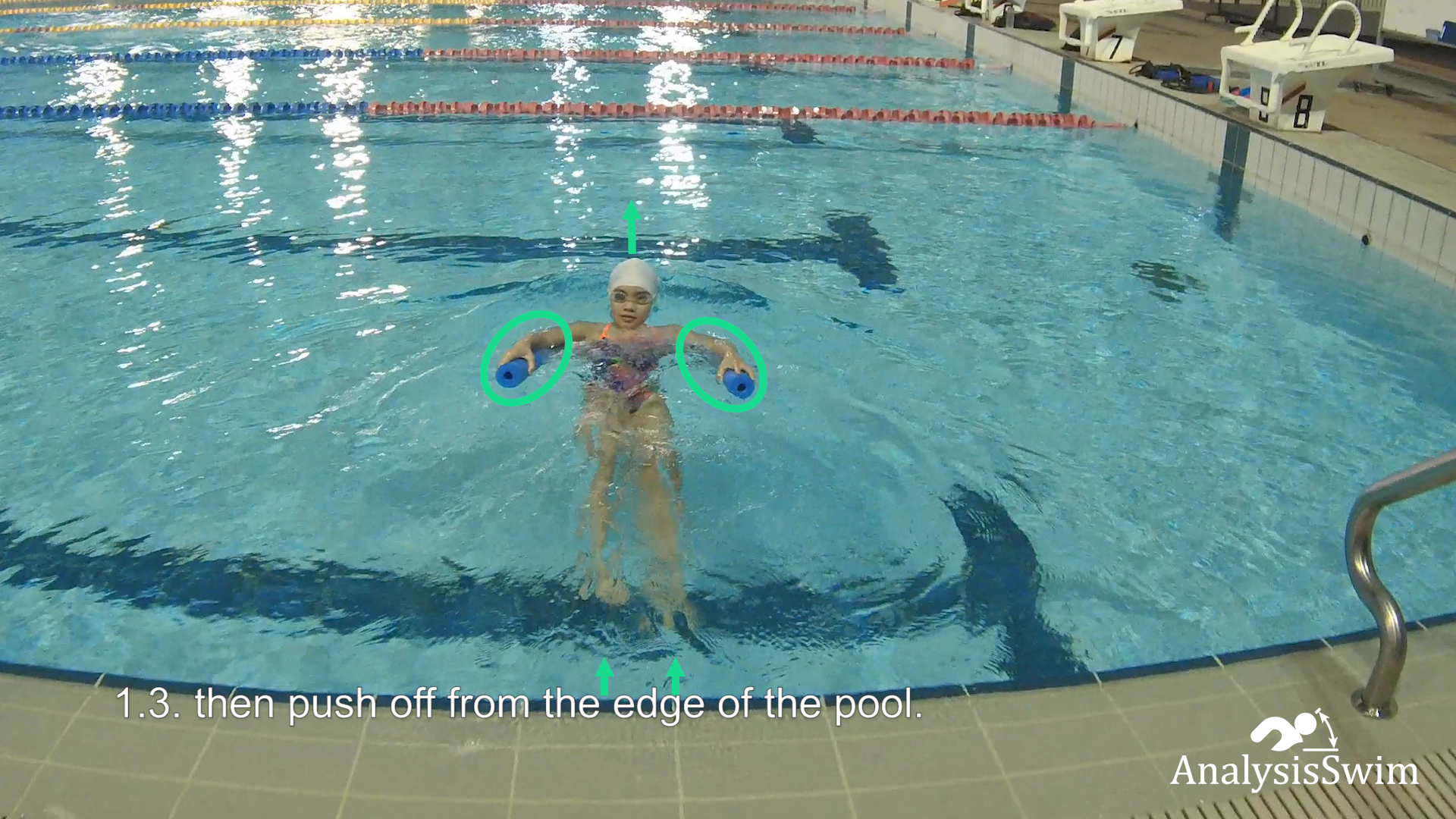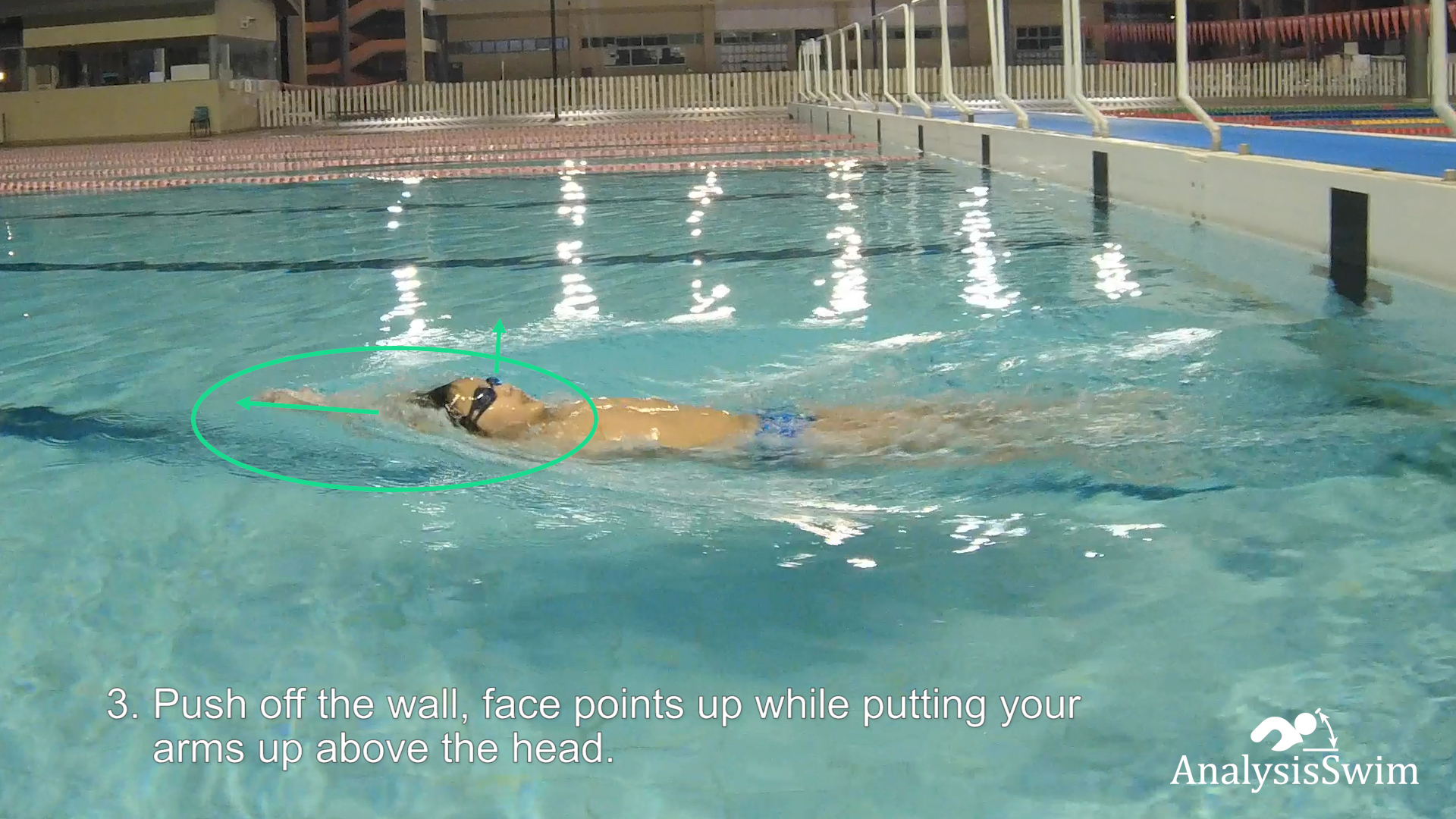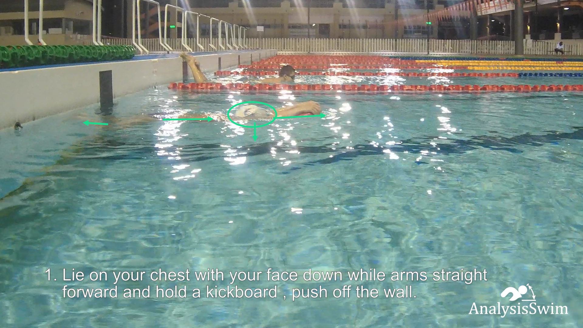 1. Put on fins. Lie on your chest with your arms straight forward, your face down and push off the wall.