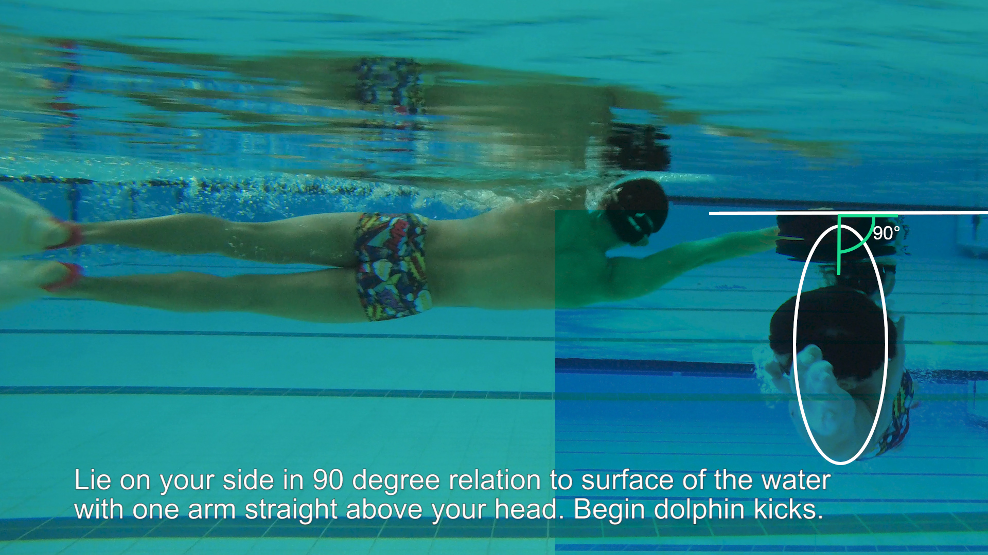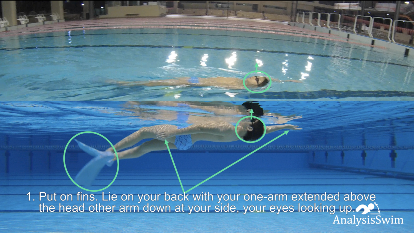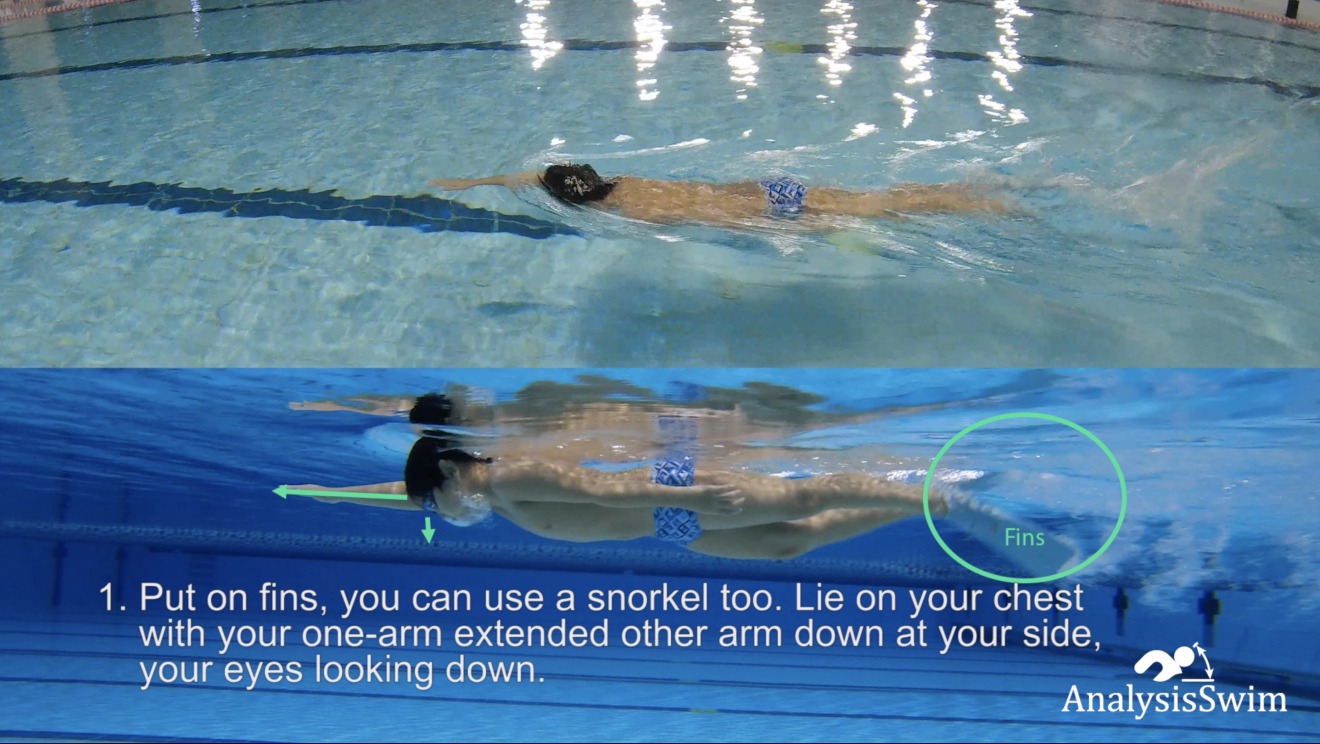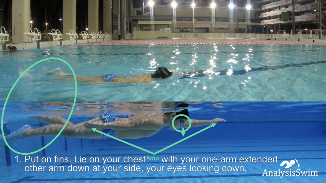 1. Put on fins. Lie on your chest with your one arm extended another arm down at your side, your eyes looking down.