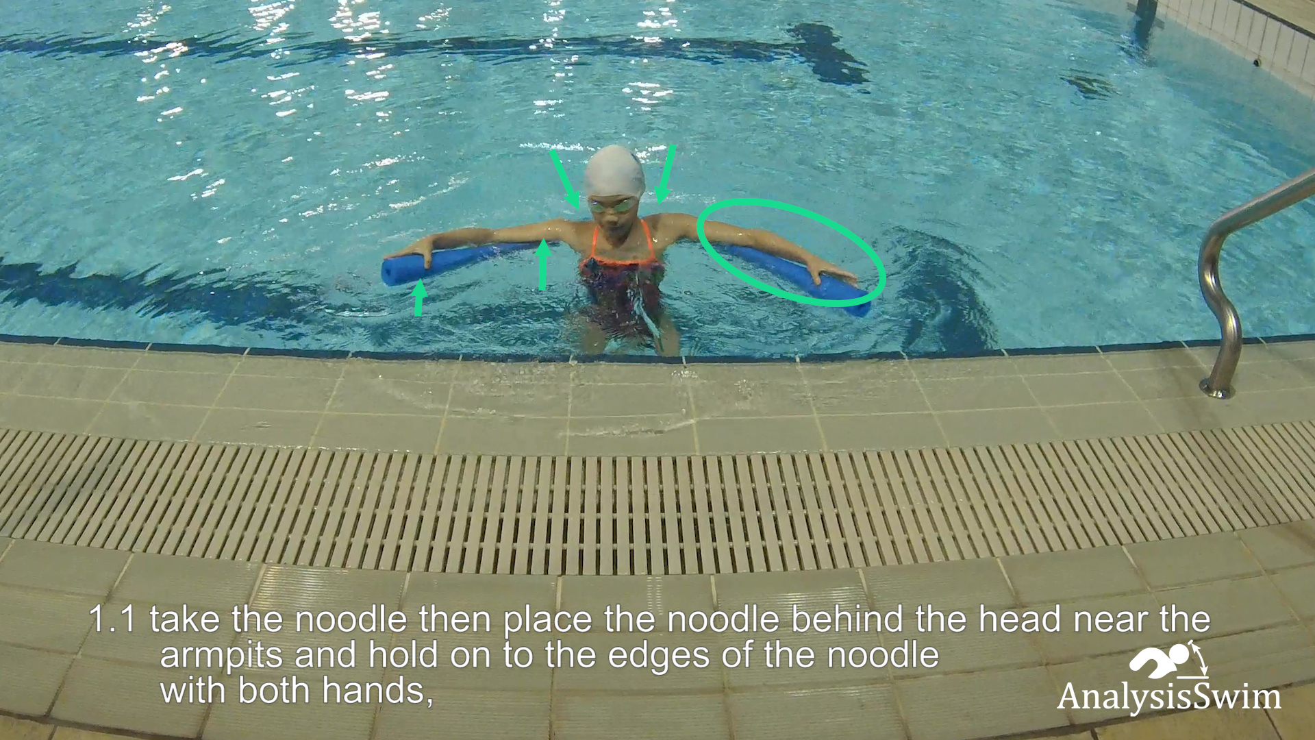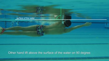 1. Put on fins, you can use a snorkel too. Lie on your chest with your one-arm extended other arm down at your side, your eyes looking down.
