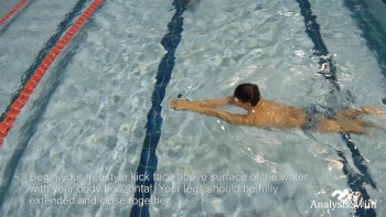 Begin your freestyle kick face above surface of the water with your body horizontal. Your legs should be fully extended and close together.