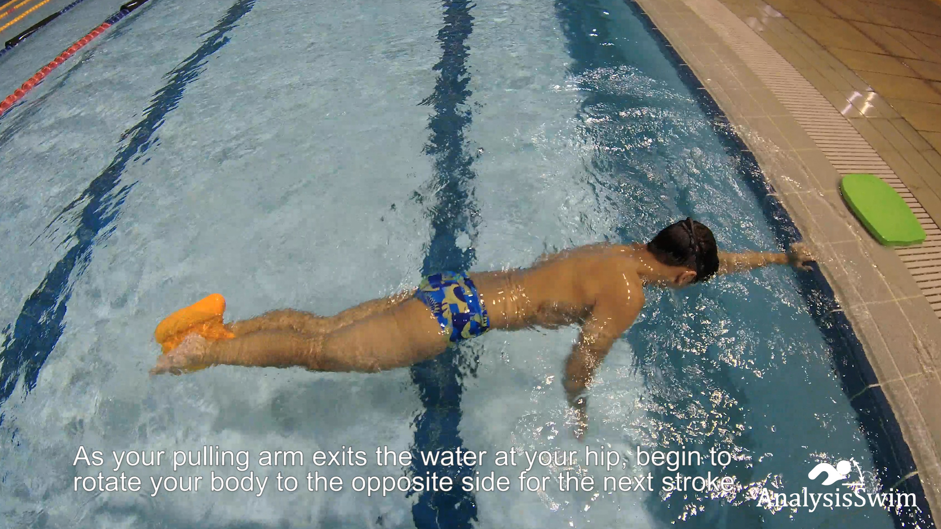 As your pulling arm exits the water at your hip, begin to rotate your body to the opposite side for the next stroke.