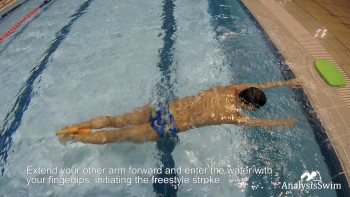 Extend your other arm forward and enter the water with your fingertips, initiating the freestyle stroke.
