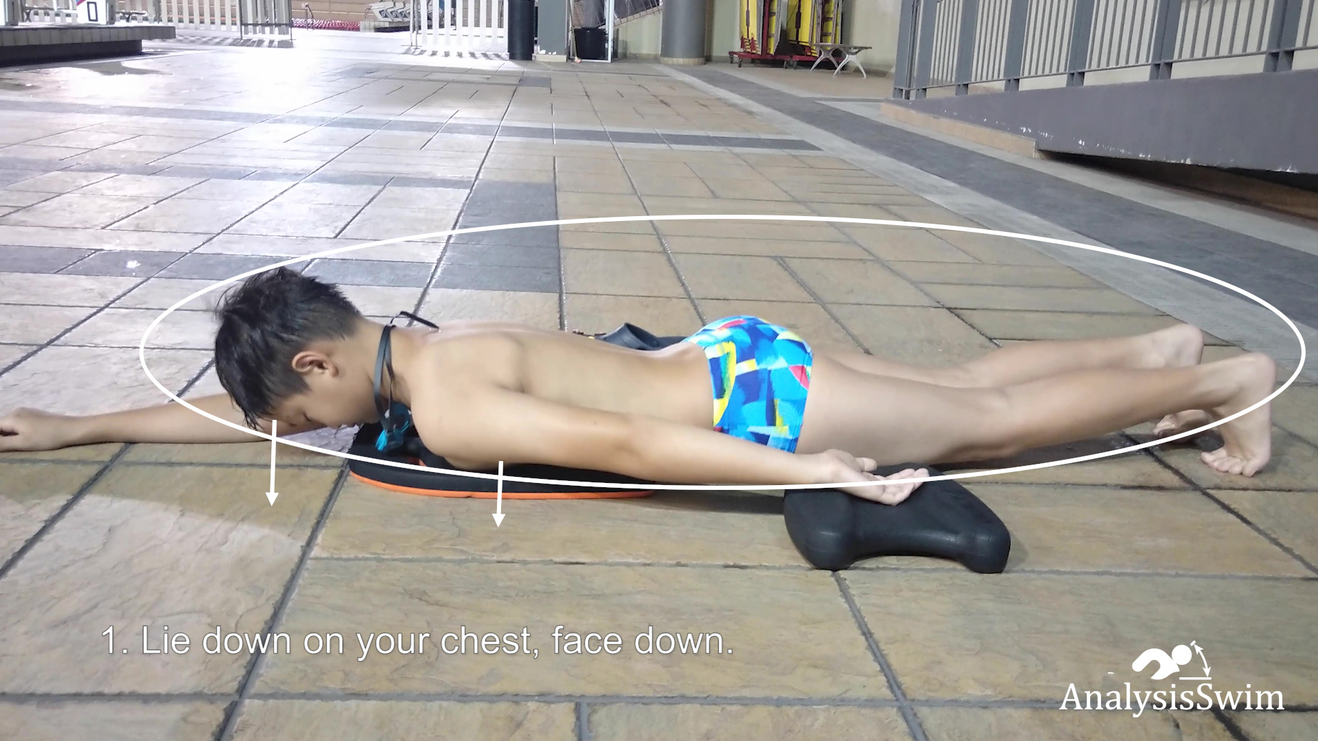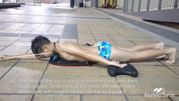 2. One arm at the top is stretched out in front and does not cross the center line of the body, the other hand below and with fingers rested on the kick board.