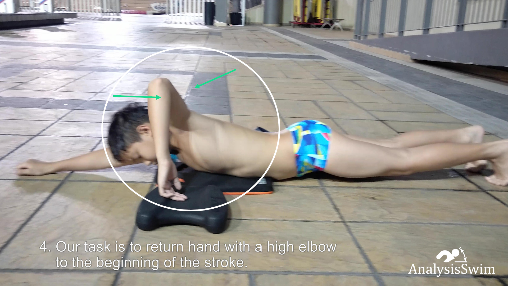 of the drill “Freestyle recovery with a high elbow on land” is to improve the position of the high elbow during recovery using shoulder and shoulder blades. The drill helps to improve the feeling of the surface of the water so that your fingers do not touch the surface when you will swim in a swimming pool.