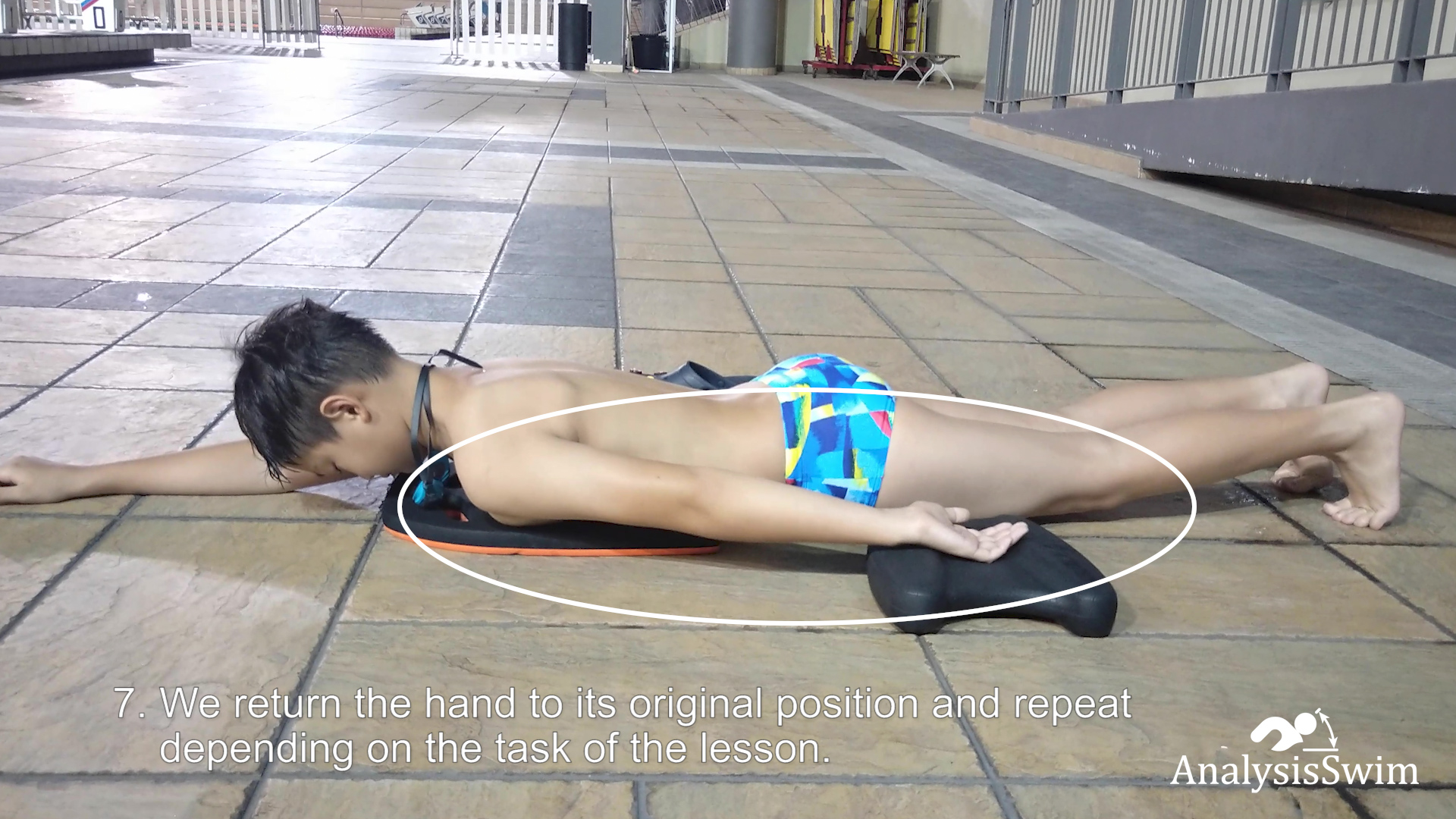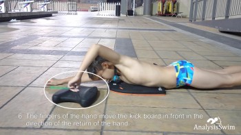 6. The fingers of the hand move the kick board in front in the direction of the return of the hand.