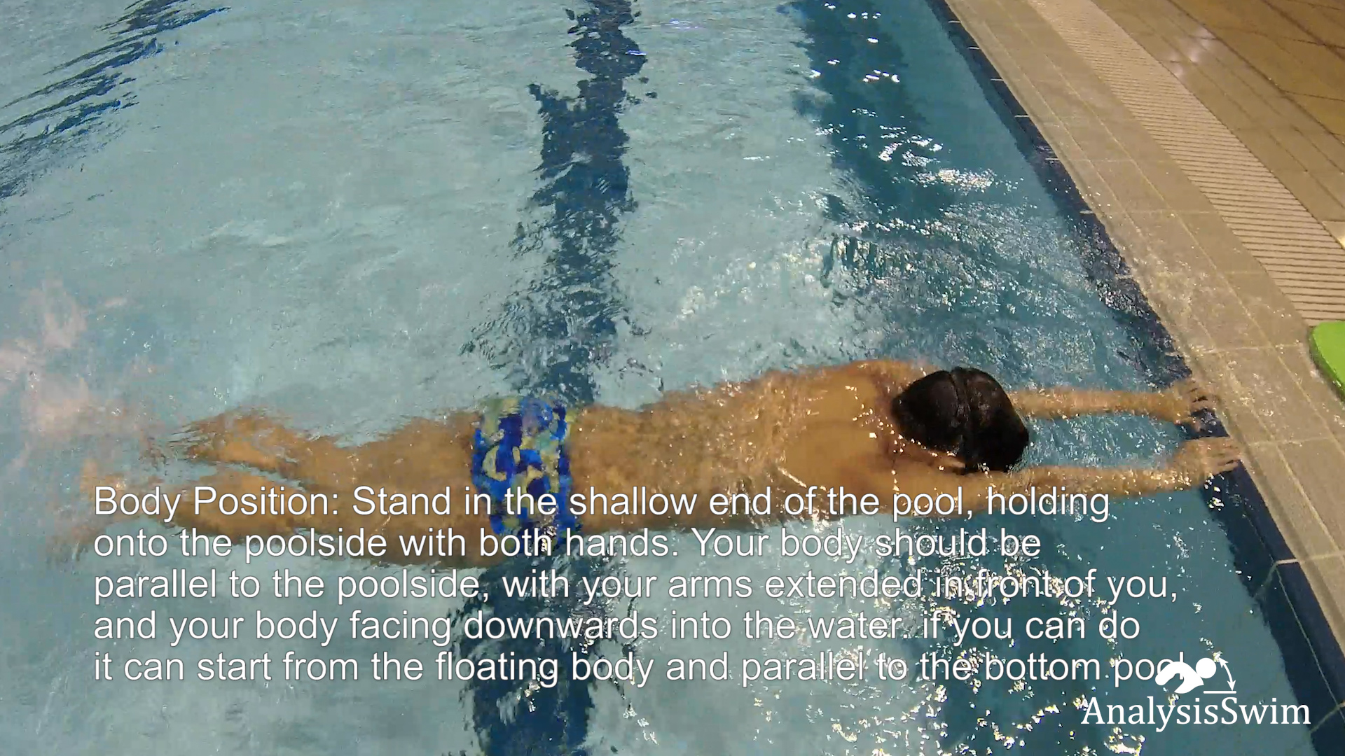 Stand in the shallow end of the pool, holding onto the poolside with both hands. Your body should be parallel to the poolside, with your arms extended in front of you, and your body facing downwards into the water if you can do it can start from floating body and parallel to the bottom pool.