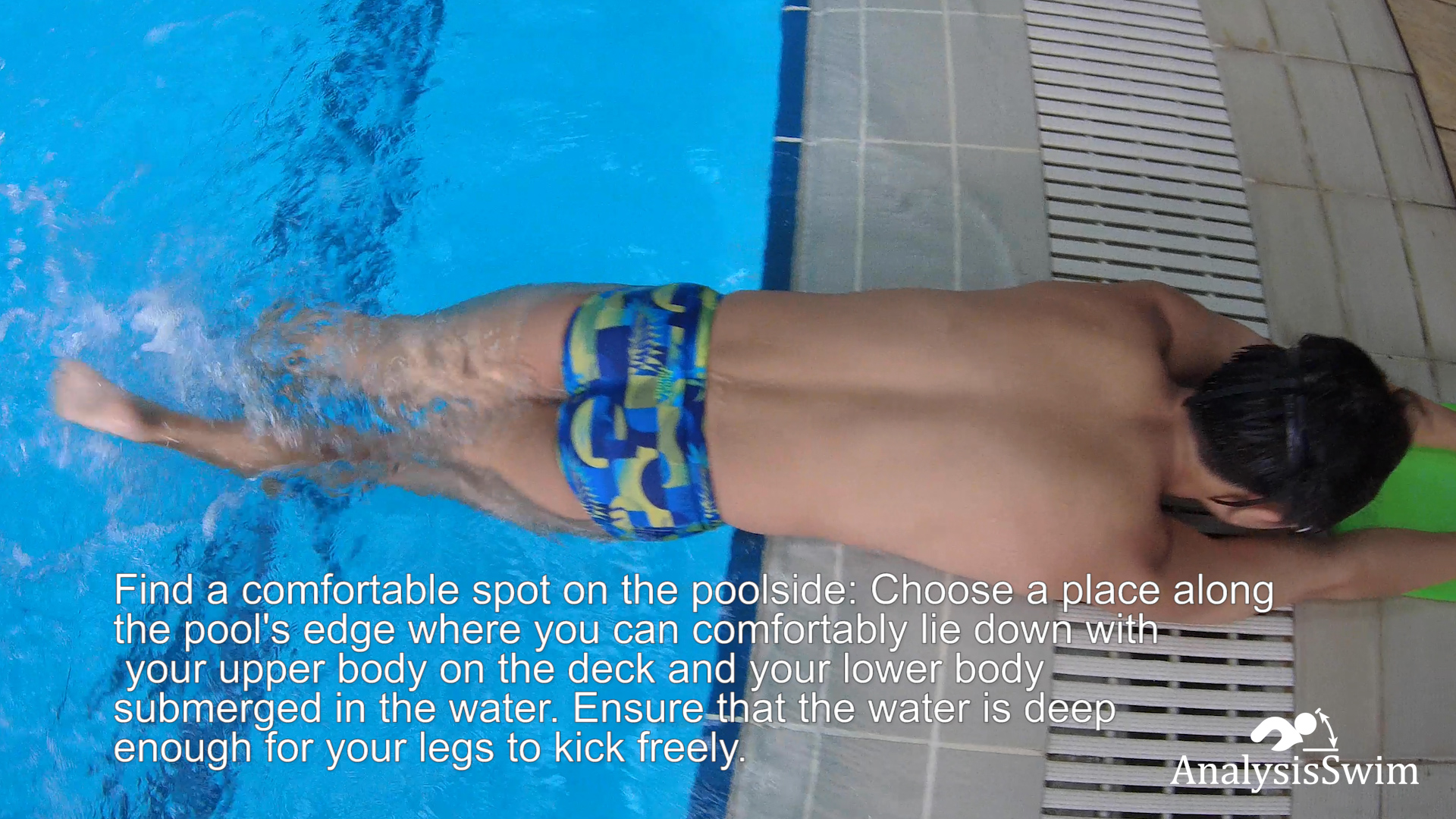 Choose a place along the pool’s edge where you can comfortably lie down with your upper body on the deck and your lower body submerged in the water. Ensure that the water is deep enough for your legs to kick freely.