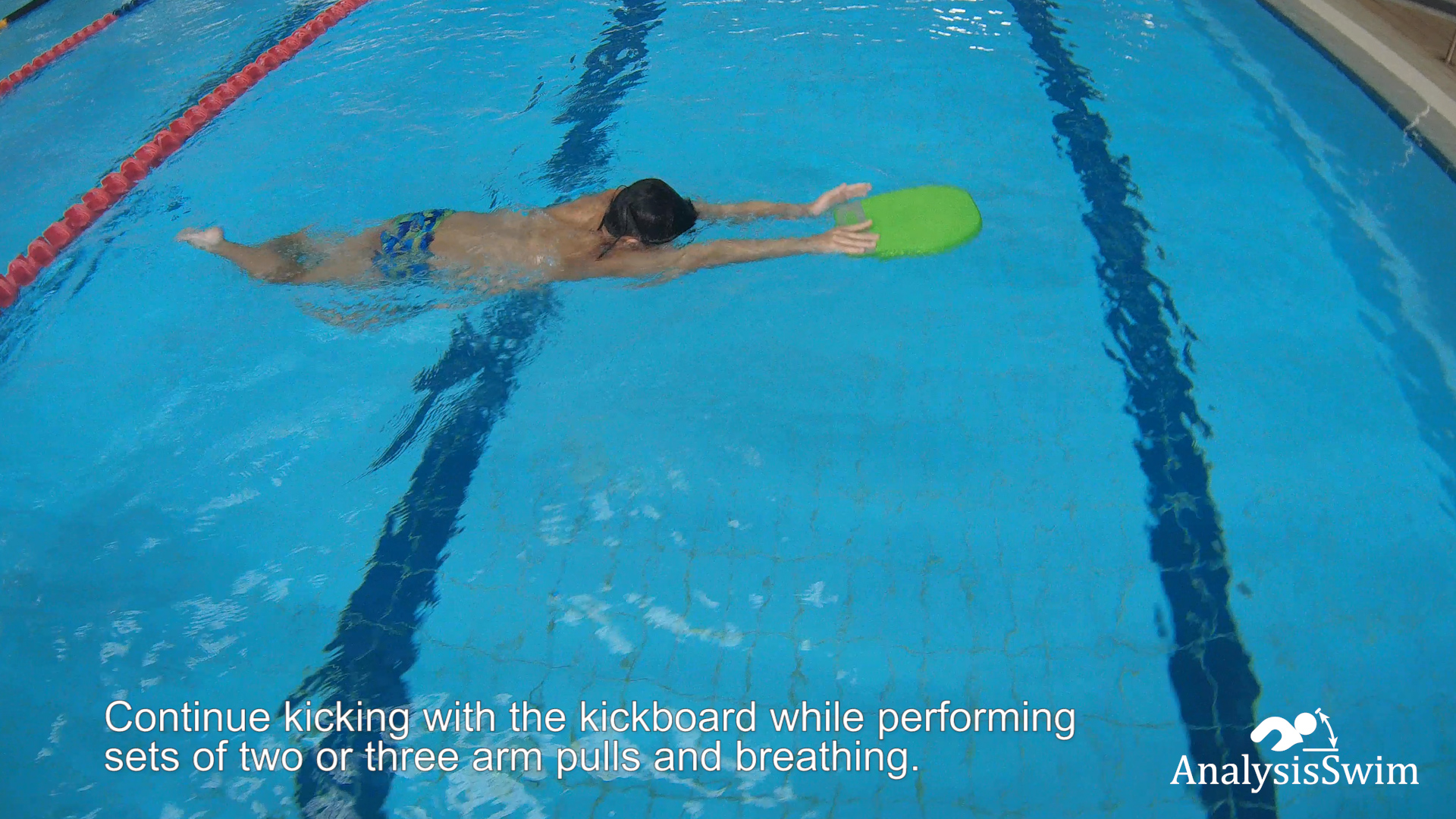 Continue kicking with the kickboard while performing sets of two or three arm pulls and breathing. Focus on maintaining a smooth and steady rhythm with your kicks and strokes.