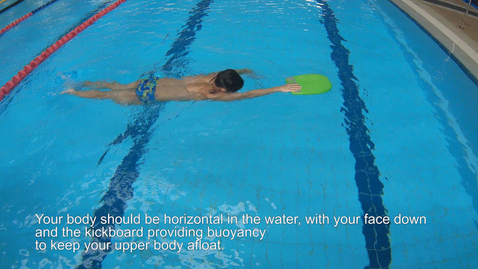 Hold the kickboard out in front of you with your arms fully extended. Your body should be horizontal in the water, with your face down and the kickboard providing buoyancy to keep your upper body afloat.