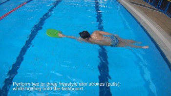Perform two or three freestyle arm strokes (pulls) while holding onto the kickboard. Each arm stroke consists of reaching forward with one arm, pulling it down and back alongside your body, and then recovering it back to the starting position above the water.