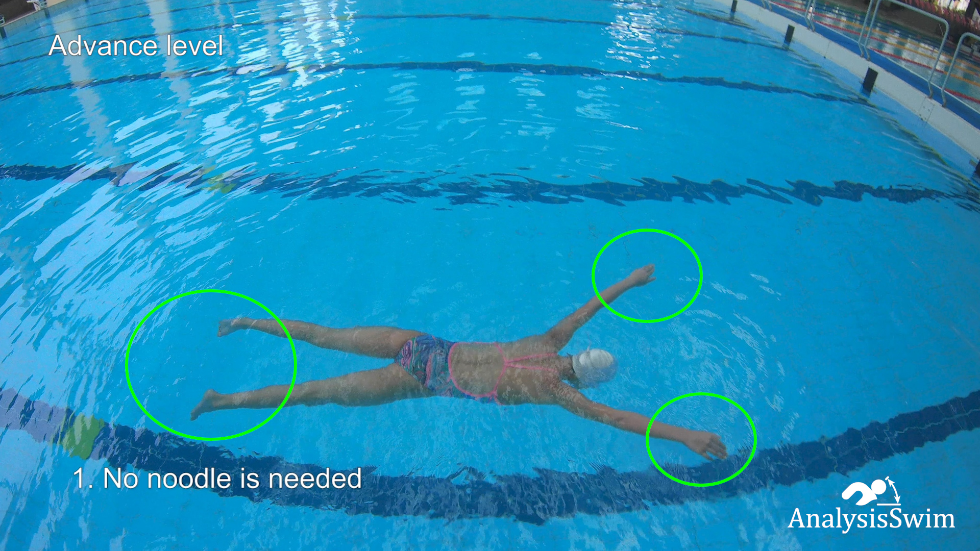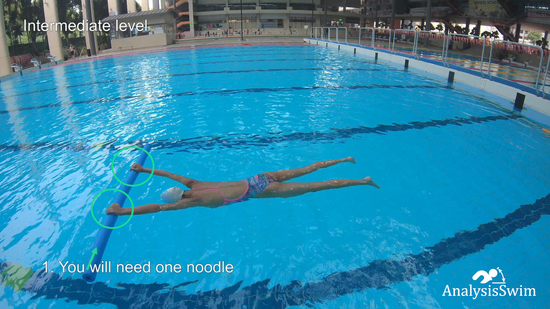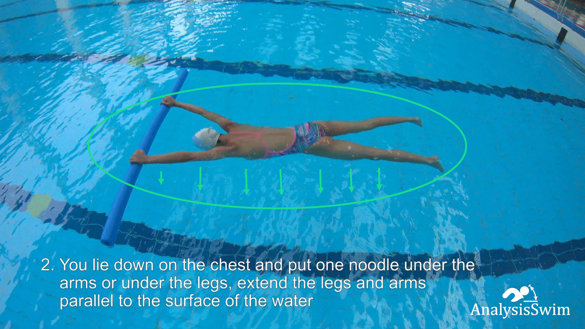 2. You lie down on the chest and put one noodle under the arms or under the legs, extend the legs and arms parallel to the surface of the water