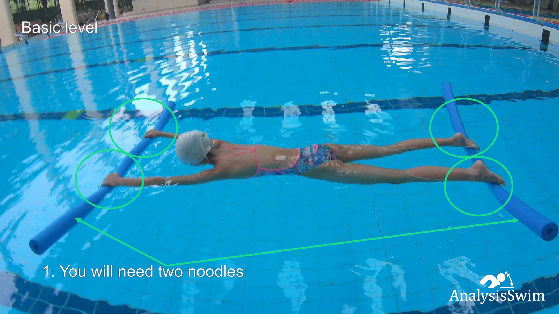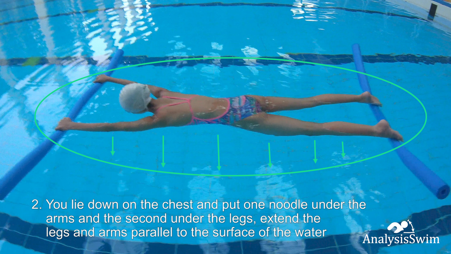 2. You lie down on the chest and put one noodle under the arms and the second under the legs, extend the legs and arms parallel to the surface of the water