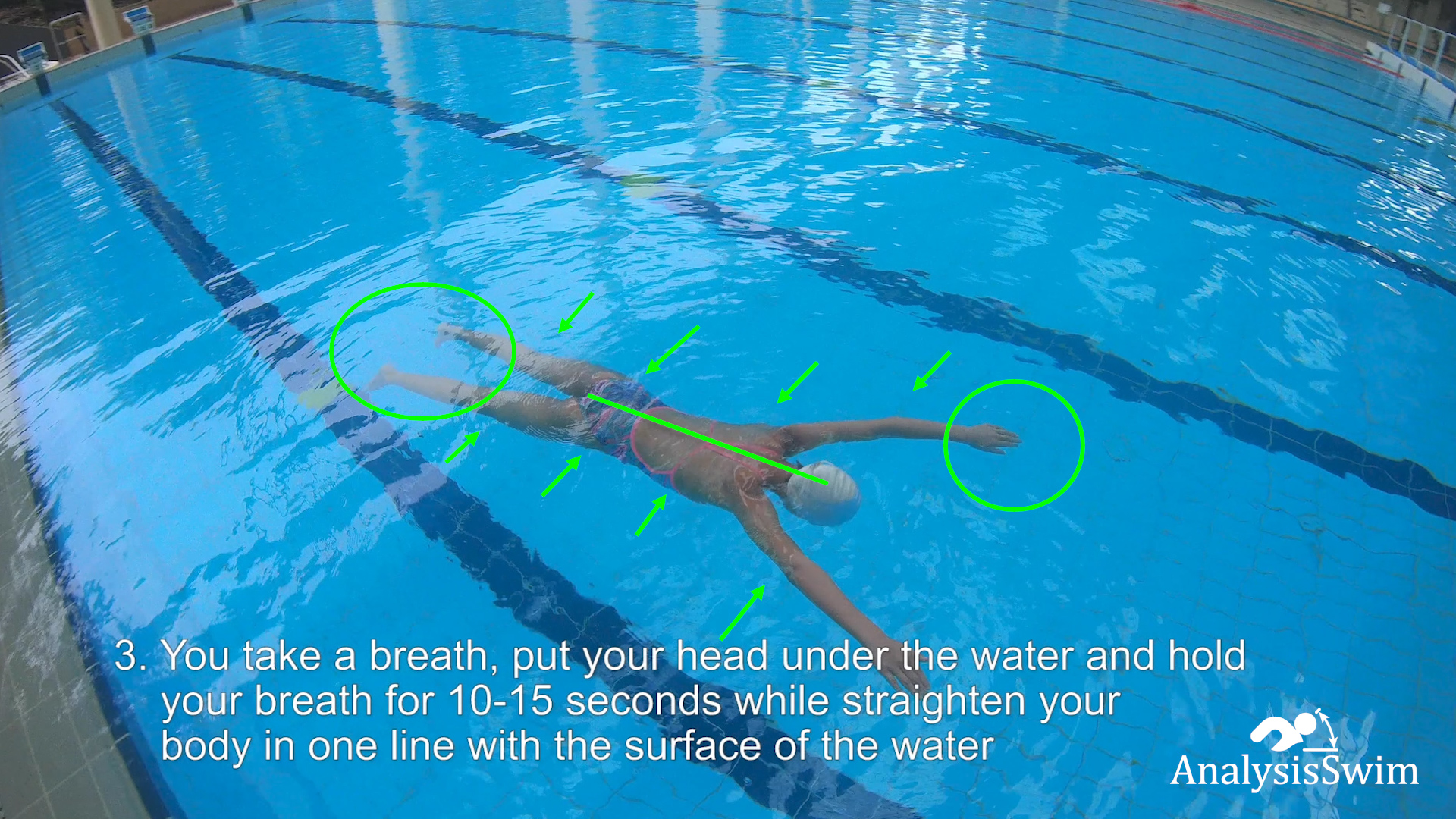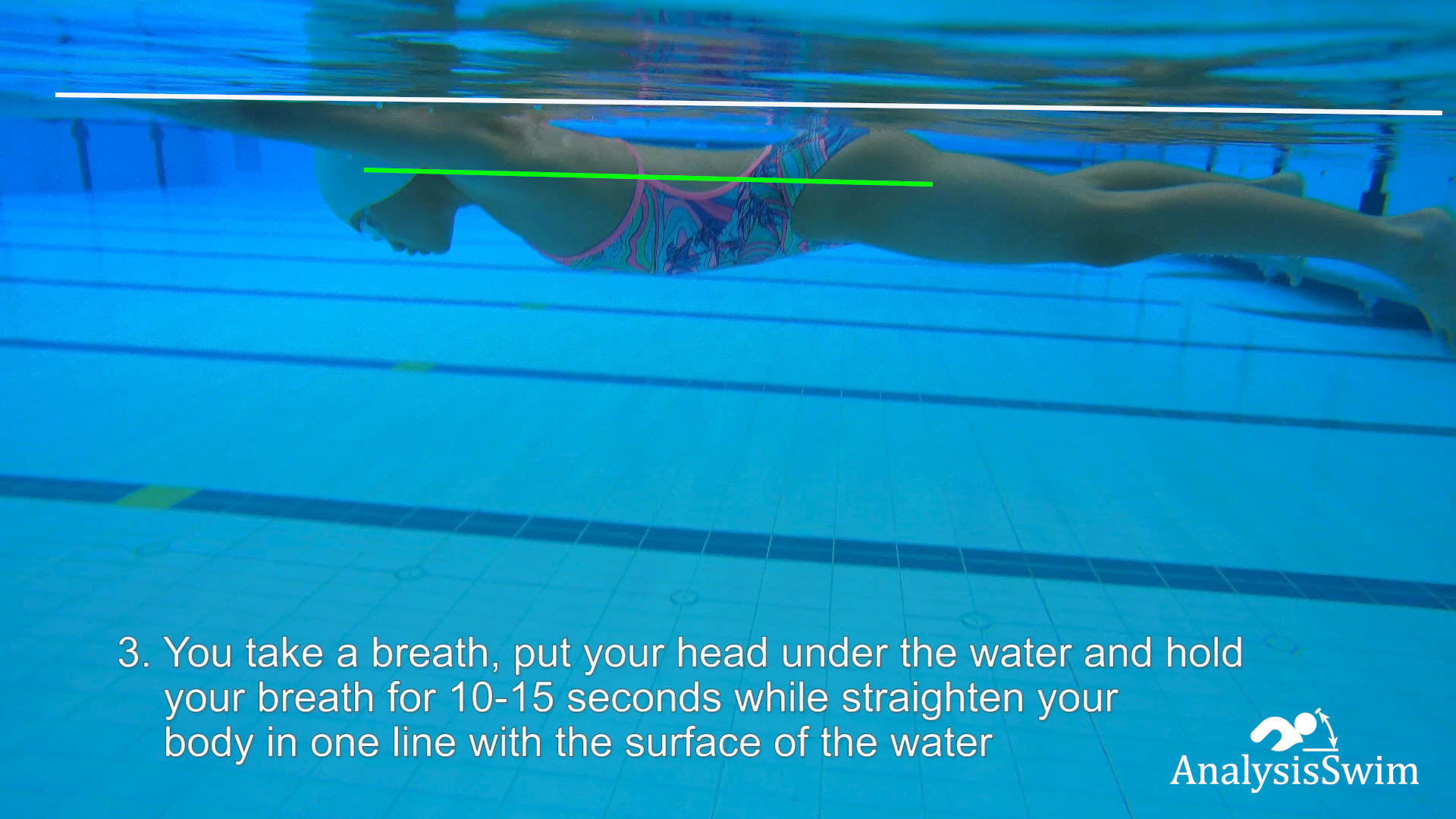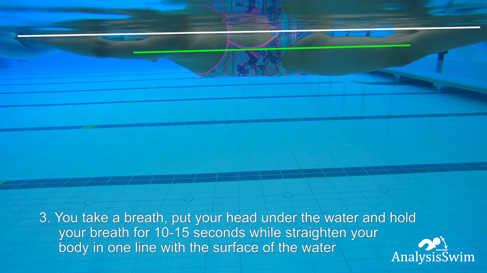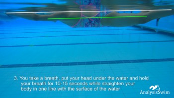 3. You take a breath, put your head under the water and hold your breath for 10-15 seconds while straighten your body in one line with the surface of the water