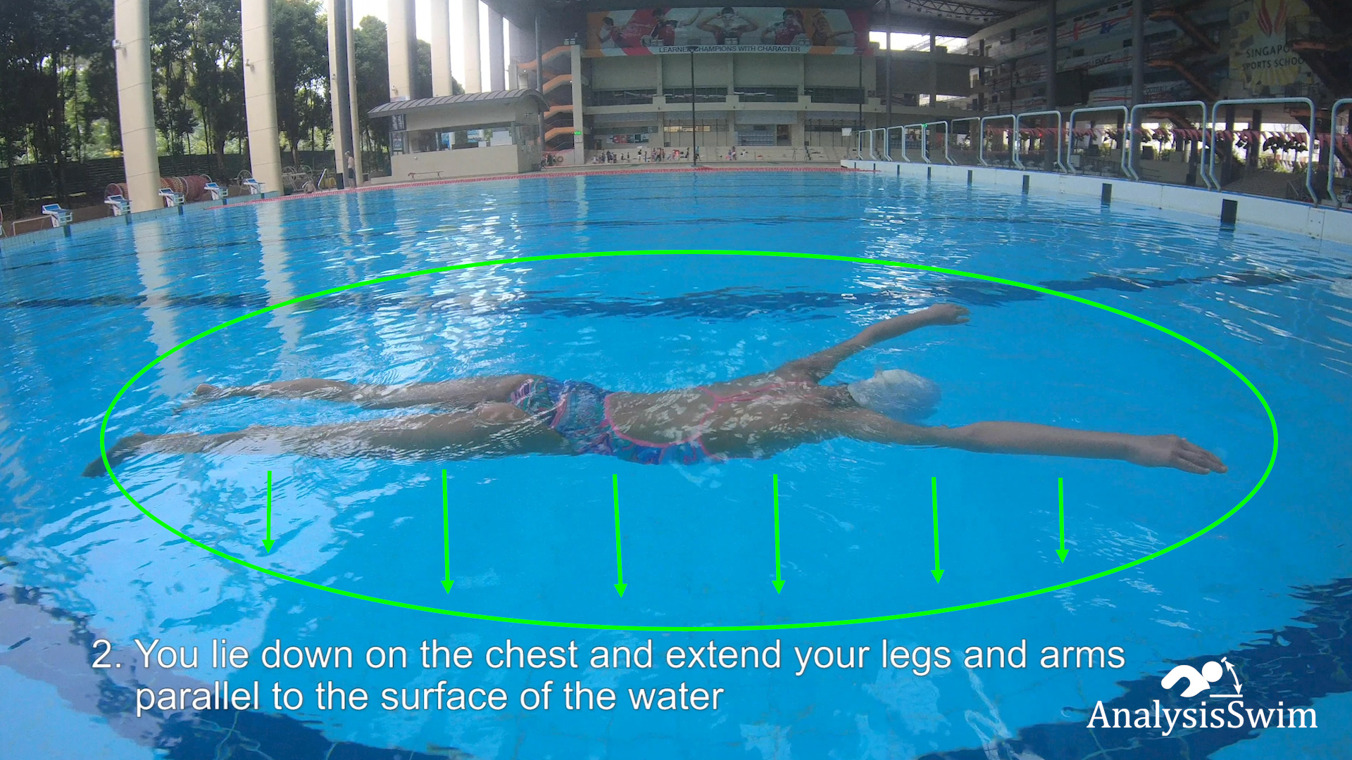 2. You lie down on the chest and extend your legs and arms parallel to the surface of the water