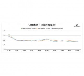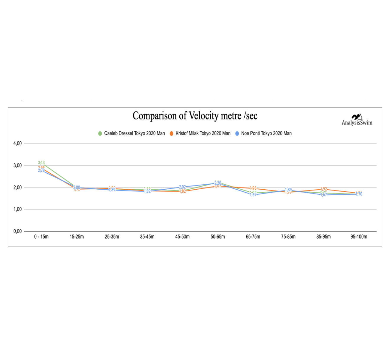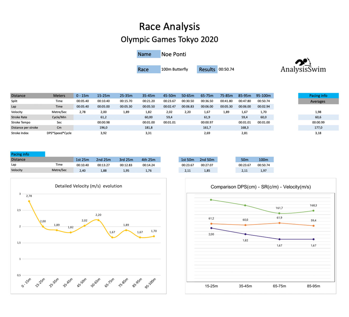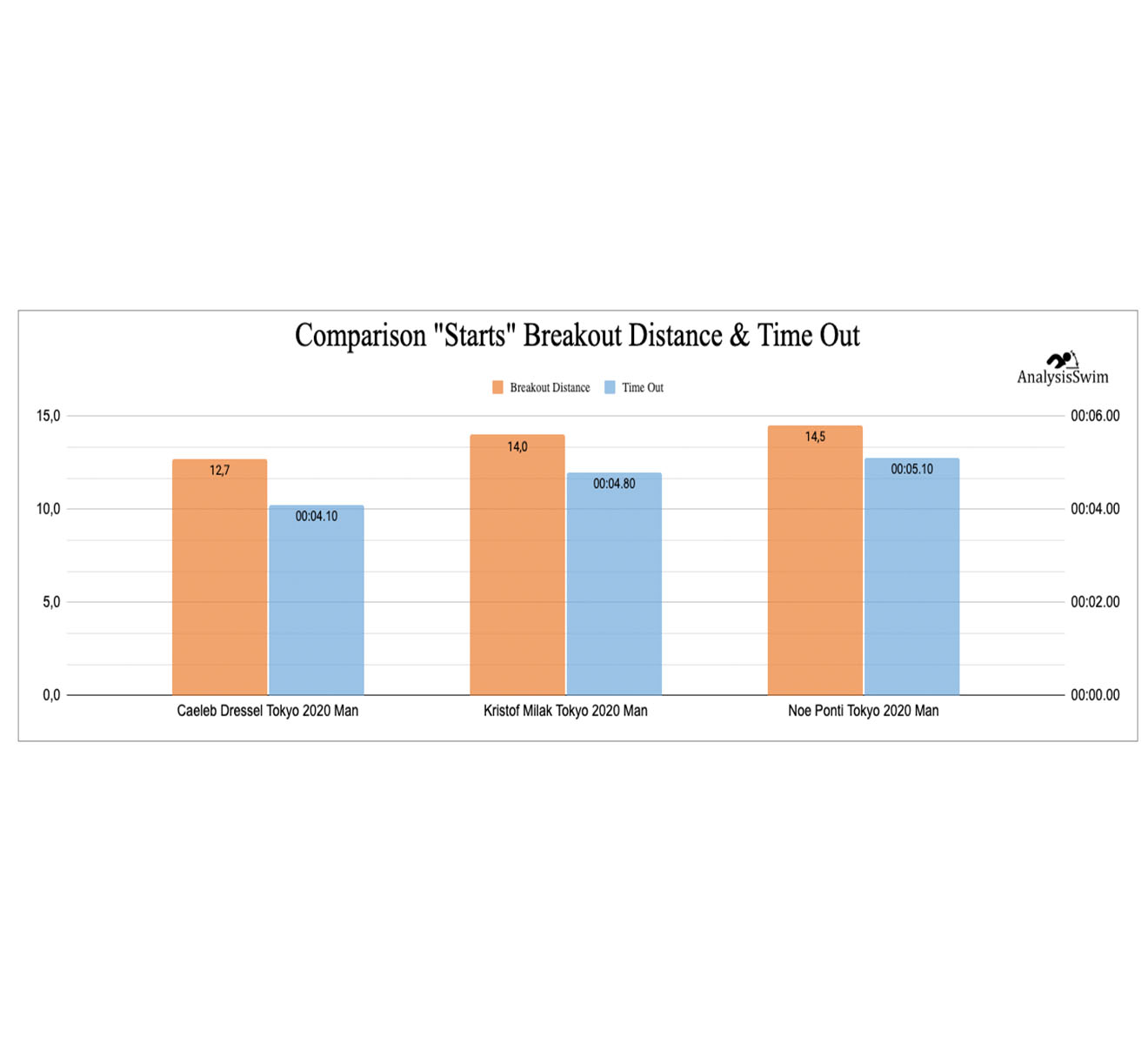 Caeleb Dressel has a short and explosive start of ~12,7 meters, and Noe Ponti made a long start of ~14,5 meters.