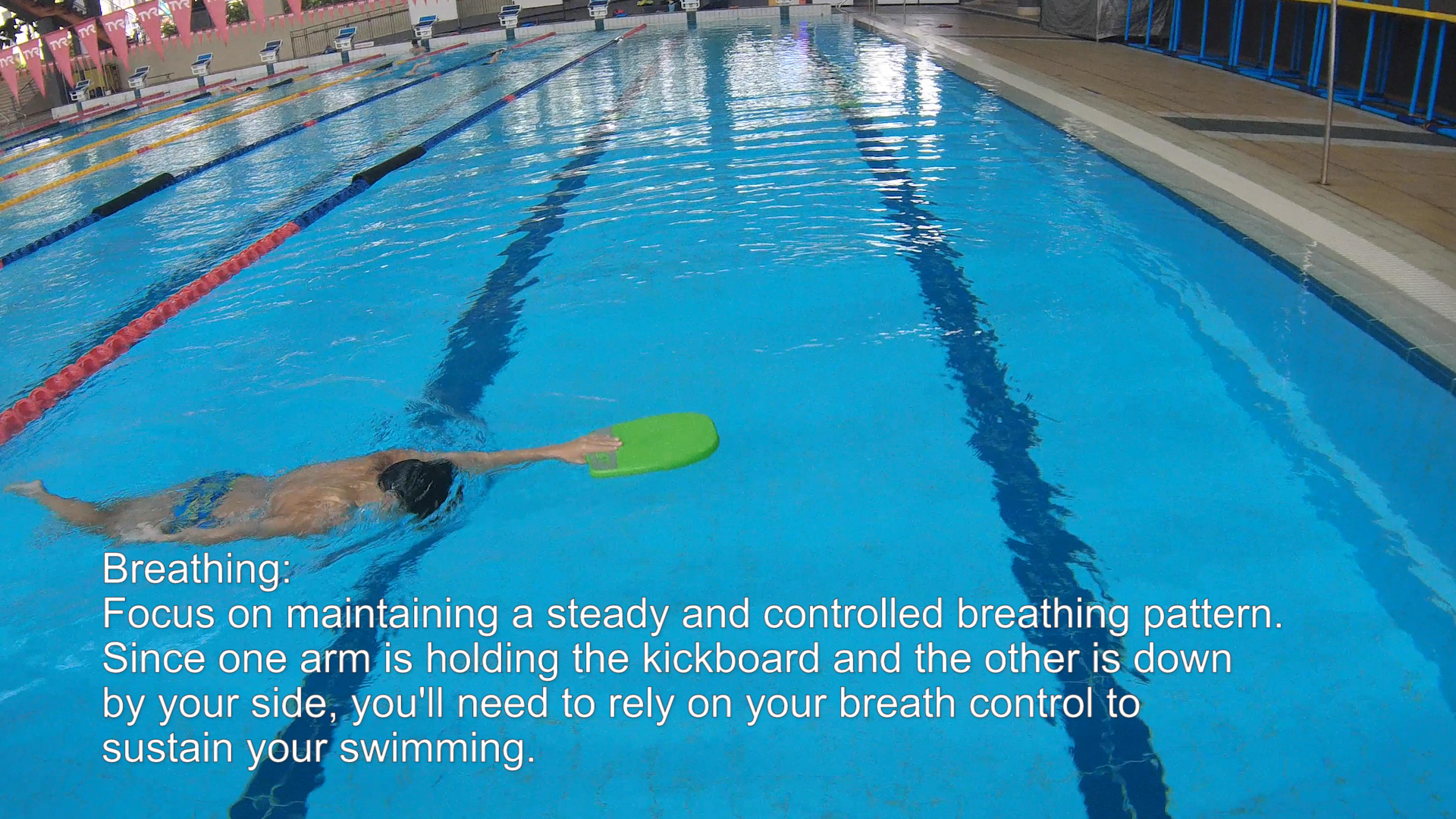 Focus on maintaining a steady and controlled breathing pattern. Since one arm is holding the kickboard and the other is down by your side, you’ll need to rely on your breath control to sustain your swimming.