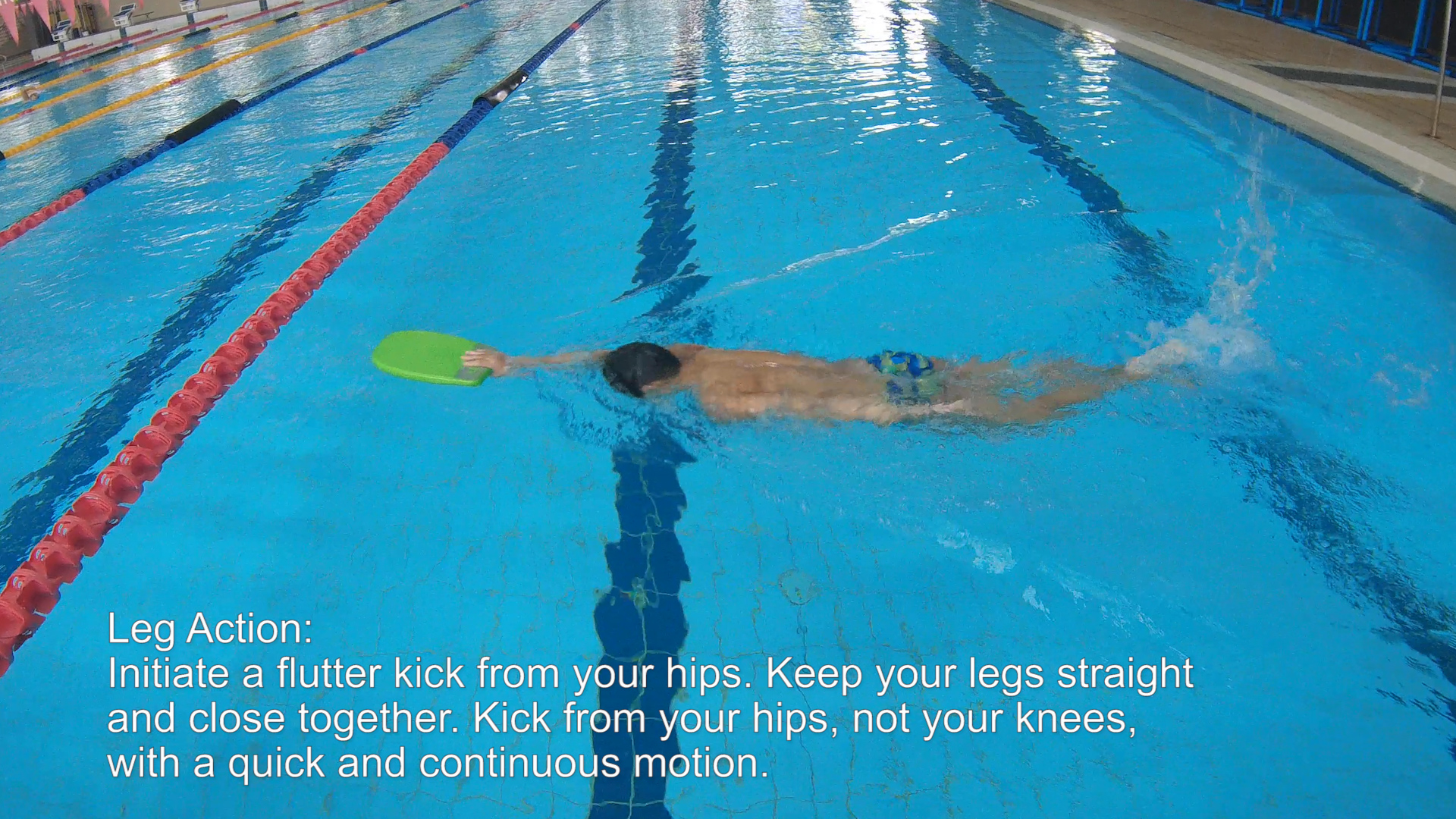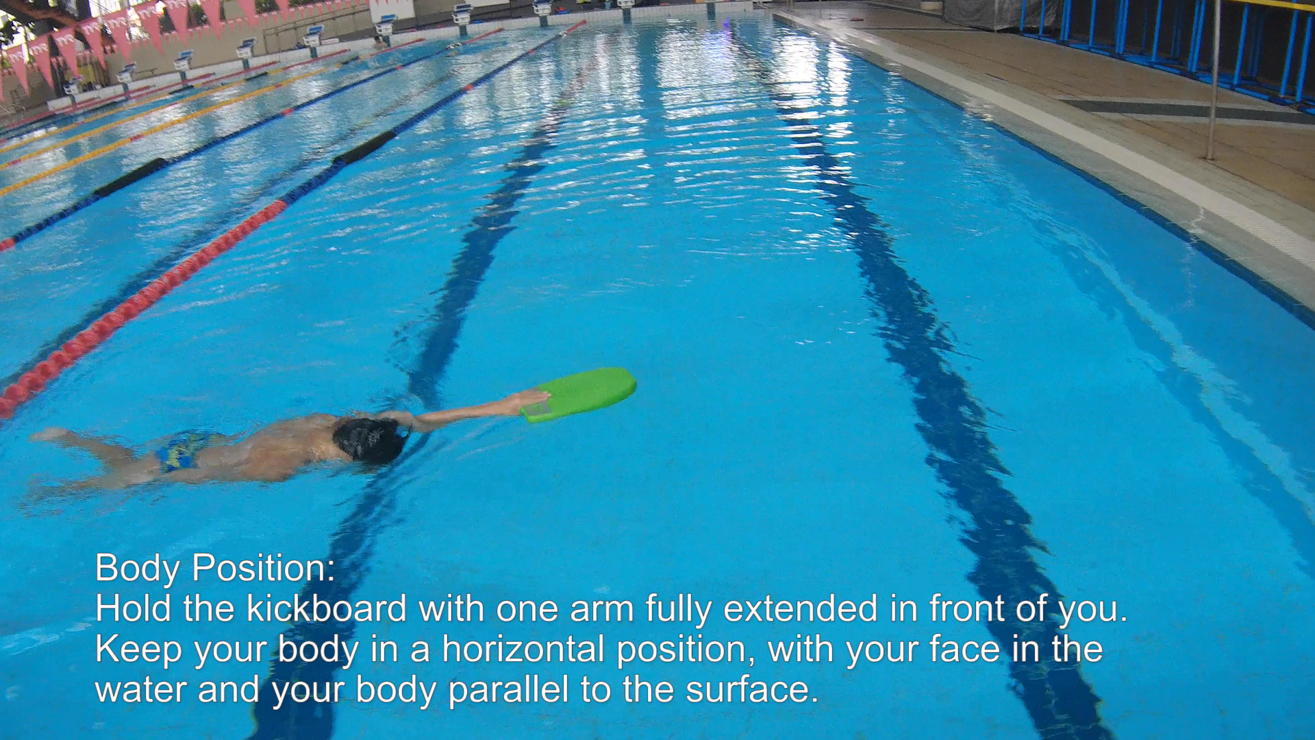 Hold the kickboard with one arm fully extended in front of you. Keep your body in a horizontal position, with your face in the water and your body parallel to the surface.