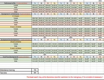 The assessment in Development B, A for moving to the next level is carried out by coaches or time can be provided from official competitions.